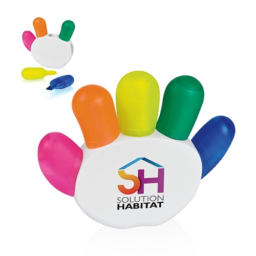 Description Très utile, cet incontournable instrument de bureau est présenté ici dans un design ludique en forme de main à destination des petits comme des plus grands.Ce set est composé de 5 surligneurs de couleur différente. Matière: polystyrène/polypropylène |