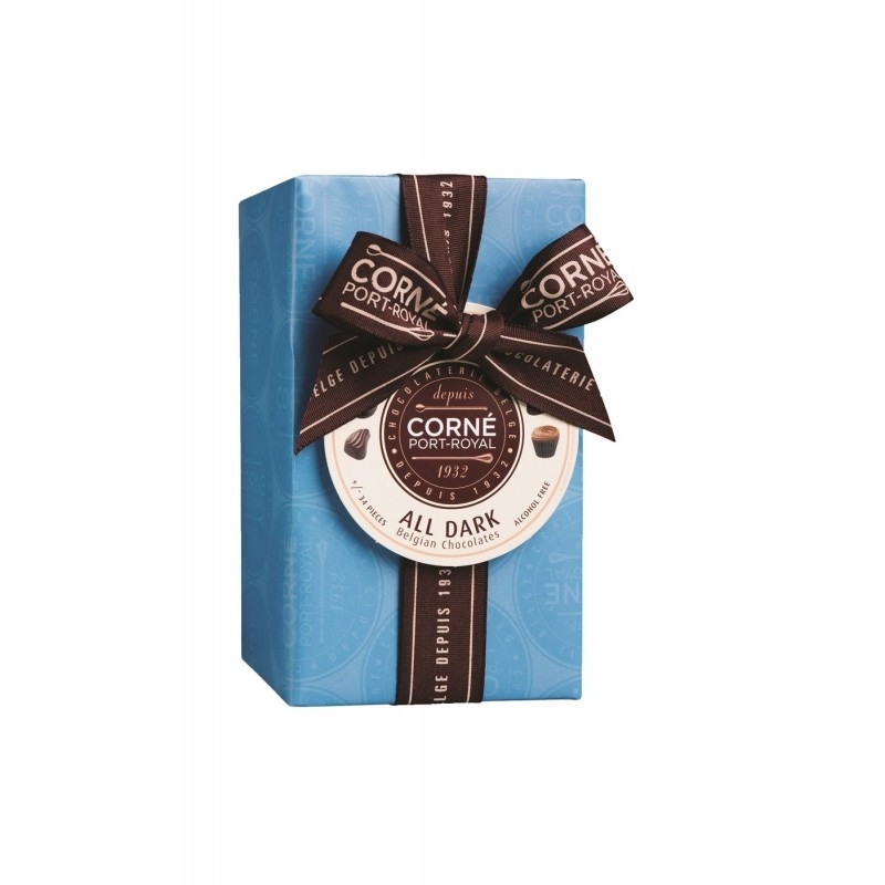 Description Ballotin 34 chocolats noirs SANS ALCOOL emballé Papier Bleu et ruban brun (*) 470 g |