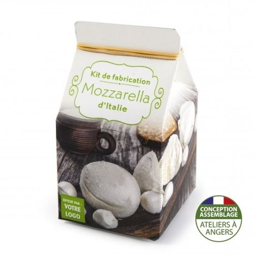Description Un mini-coffret gastronomique DIY Mozzarella est une idée cadeau originale pour tous vos clients et partenaires. Un petit coffret qualitatif qui plaira à tous vos clients.Contient pour 1 fromage frais de 150 à 200g (pour 1 l de lait) :Coffret de 60 x 60 x 110 mm1 étamine 30x20 mm1 sachet de ferments lactiques de 5 g1 sachet de présures Origine France5 g de feuilles de basilic bio10 g de gros selrecette Personnalisation :Impression en quadrichromie à votre communication à partir de vos fichiers d'impression.Pour une quantité inférieure à 500 exemplaires, possibilité d'ajout d'un adhésif sur boîte kraft. Larg. 10 H. 10  |