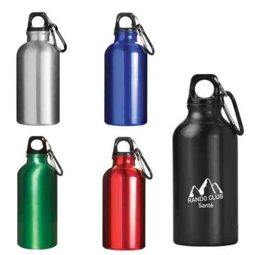 Description Gourde métal étanche, en aluminium avec mousqueton en aluminium. Contenance de 400ml.Les gourdes sont destinées à recevoir des boissons froides, non-corrosives.Les prix comprennent un marquage en 1 couleur ou une gravure au laser à un endroit. |