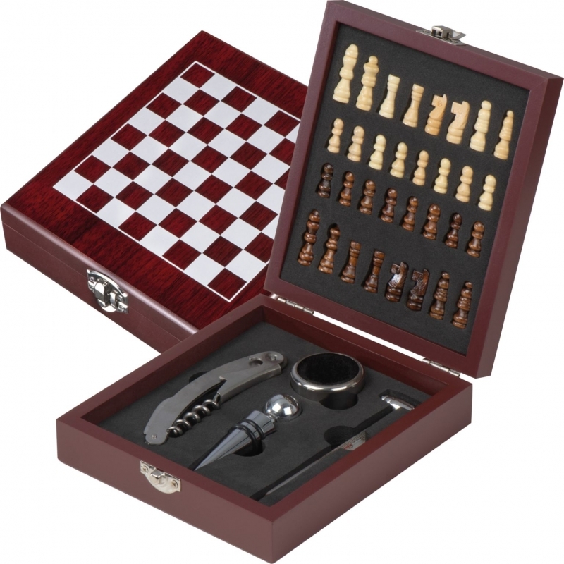 Description Set à vin, 4 pièces, dans un beau coffret bois. Jeux d échecs inclus. Tampographie sur le couvercle de la boîte*. |