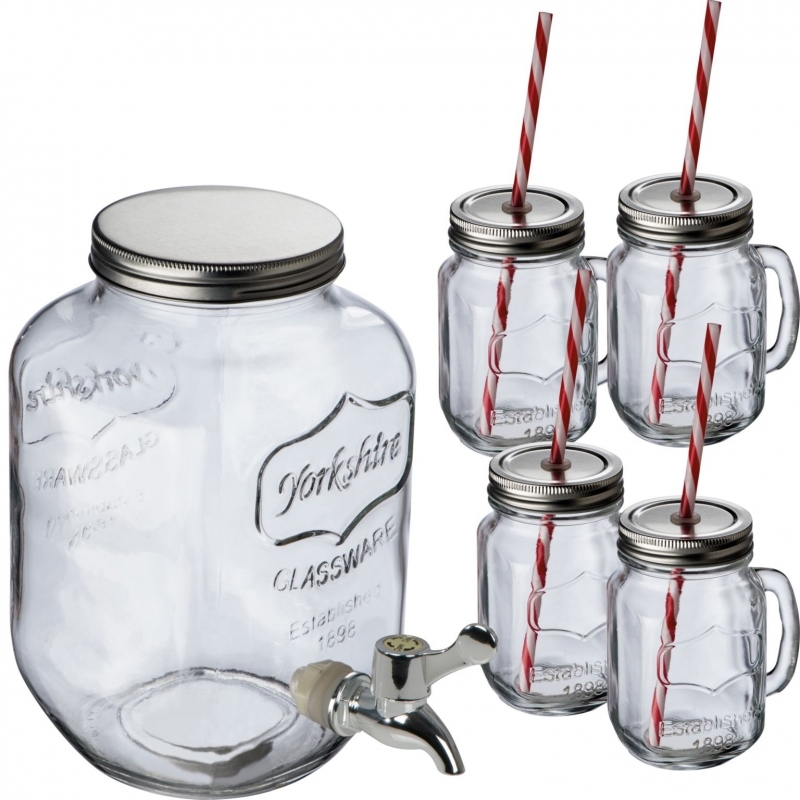 Description Fontaine en verre (4 Litres), 4 verres et 4 pailles en plastique. Gravure laser sur le couvercle de la fontaine. |