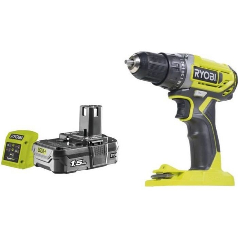 Description Percer / Visser / Fixer RYOBI PACK PERCEUSE-VISSEUSE SANS FIL 18V ONE+ AVEC UNE BATTERIE 1,5 AH ET UN CHARGEUR 1,5 APERC |
