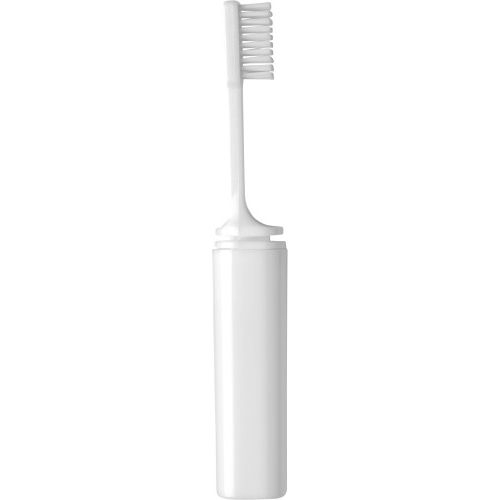 Brosse à dents de voyage en plastique.Matières : Nylon/PS.Cadmium ; PAHs ; Phthalates.Marquages : Tampographie : Sur le côté ; Doming : Sur le côté. H. 160