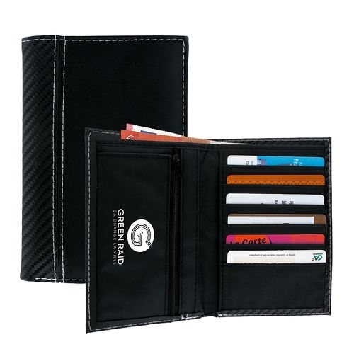 Description Sobre et élégant, un porte-feuille qui convient aussi bien à monsieur qu à madame. Coloris noir, dos façon cannage en damier, devant lisse avec surpiqure blanche avec pochette transparente pour carte grise. Marquage à l'intérieur, côté carte en 1 couleur blanc conseillé et par défaut.PVC |