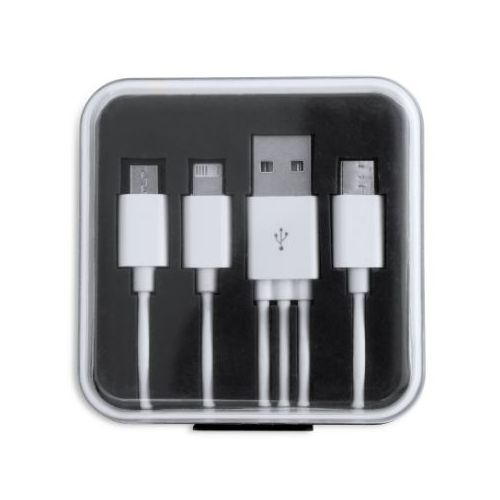 Boîtier avec câble de chargeur 3 en 1. Présenté dans un étui avec support pour smartphone intégré. Connexion micro USB, type C et Lightning.6,7cm/3,3cm/6,8cm