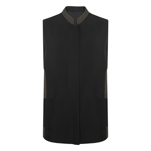 Blouse femme sans manches. Fermeture centrale avec boutons-pression cachés. Col mao, coutures latérales et pinces poitrine. Deux poches plaquées devant.100% Polyester, 130g/m².* Etiquette Detachable.