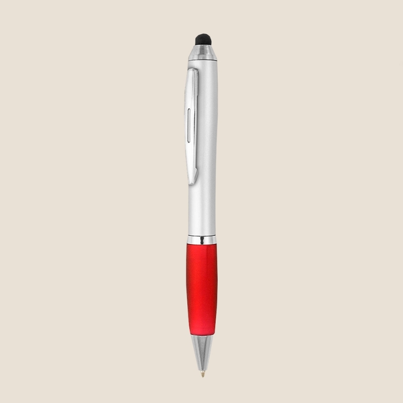 Description Stylo fabriqué en plastique et clip métallique avec pointeur touch pour écrans tactiles de la même couleur que le corps. |