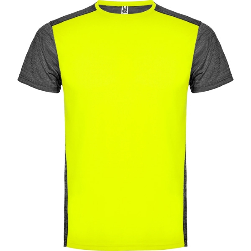 Description T-shirt technique manches courtes.1. Col rond.2. Combiné en dos, épaules et manches avec deux tissus de polyester.3. Tissu principal face avant bird's eye et tissu space dye en face arrière.4. Le dos est légèrement plus long que le devant. |
