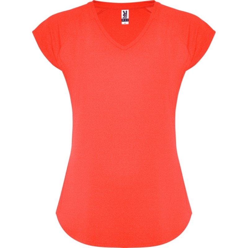 Description T-shirt technique multisport pour femme, manches courtes style raglan. Col V.Tissu polyester touché coton. Coupe ajustée. |