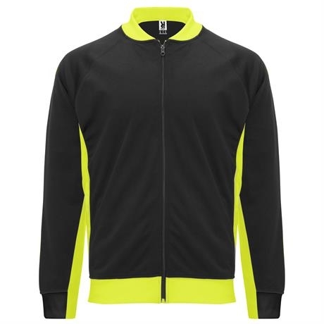 Description Veste sportive combinée.1.- Manches raglans. 2.- Panneaux combiné sur latérales et manches.3.- Col, poignets et bas en côte 2x1 contrastés.4.- Deux poches latérales zippées.5.- Doublure intérieure filet ton sur ton. |