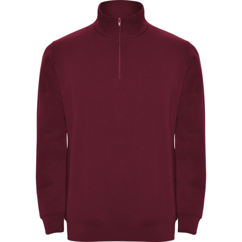Sweat avec demi zip ton sur ton et col montant. Intérieur du cou même tonalité. Bande de propreté renforcée à l’intérieur du col. Poignets et ceinture en côte 1x1.