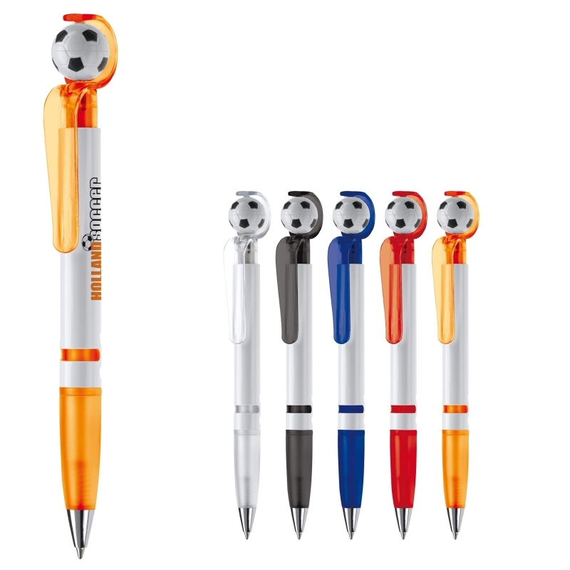 Description Stylo bille en plastique avec poussoir en forme de ballon de football. Le ballon tourne sur lui-même. Encre bleue. |