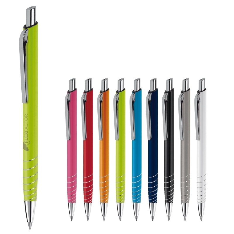 Description Stylo bille design en aluminium avec clip et bouton pressoir chromé. Avec anneaux torsadés pour un design attrayant. Cartouche d'encre bleue. |