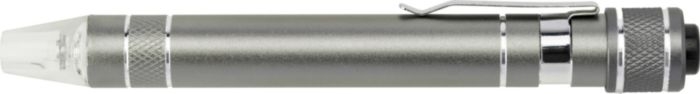 Description Tournevis en métal et aluminium avec 3 embouts plats et 3 embouts cruciformes muni d'une LED. |
