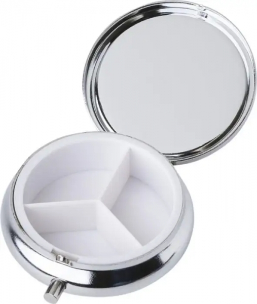 Description Boîte à pilules en métal munie de 3 compartiments en PP dans une boîte cadeau. |