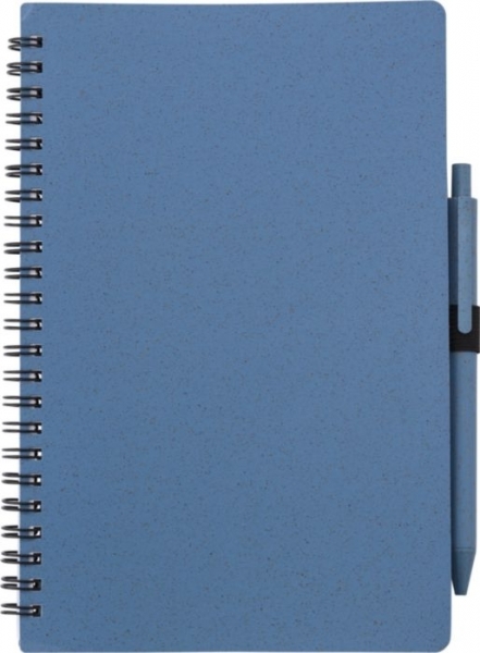Carnet à spirale A5 en fibre de paille avec couverture en PP contenant 70 feuilles lignées et un stylo en fibre de paille, mine Bleue.
