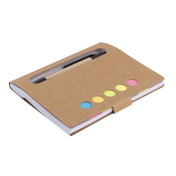 Description Bloc-notes autocollantes avec 50 feuilles lisses à l'interieur et post-it de cinq couleurs différentes et un petit stylo assorti. |