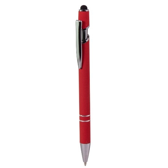 Description Stylo en aluminium recyclé avec une finition caoutchoucté avec un pointeur pour écrans tactiles sur le dessus à encre bleue. |