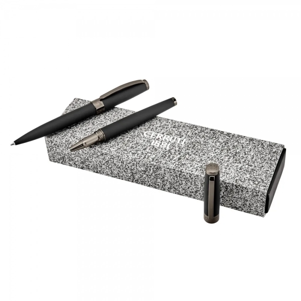 Description Parure Easton Black composée d’un stylo bille et d’un stylo roller, au design sobre et contemporain sublimé par une finition noire élégante. Le stylo bille offre une écriture fluide et précise pour un usage quotidien, tandis que le stylo roller assure un tracé plus intense et confortable. Présentée dans un coffret soigné, cette parure constitue un cadeau d’affaires raffiné, idéal pour valoriser votre image avec discrétion et professionnalisme. |