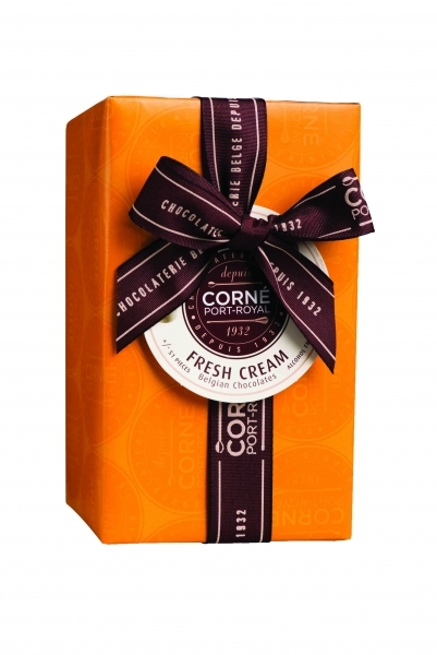 Description Ballotin 17 chocolats assortis SANS crème Papier Jaune et ruban marron 235 g |