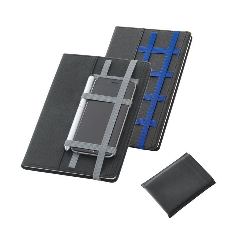 Description Bloc-notes A5 en simili cuir, couverture rigide et 160 pages non lignées. Contient des élastiques capables de supporter des stylos à bille (non inclus), un smartphone ou des cartes et un élastique pour fermer le bloc-notes. Livré dans une pochette non tissée.150 x 210 mm | Housse: 185 x 240 mmPropriétés : Taille A5, Feuilles non lignéesSimili cuirEmballage : Housse en non-tissé - Emballage après impression : HousseMarquage par défaut : Bloc-notes - Devant (Sérigraphie - 25 x 160). |
