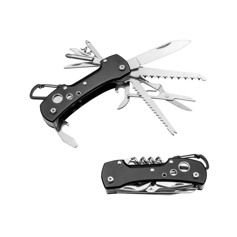 Canif multifonction en acier inoxydable avec 12 pièces et mosqueton. Fourni dans une boîte cadeau.89 x 16 x 32 mm | Coffret: 104 x 39 x 20 mmPropriétés : En acier inoxydable, Livré avec coffret cadeauAcier inoxEmballage : Sachet, Boîte noir - Emballage après impression : Sans sachet individuel, Boîte noirMarquage par défaut : Limonadier - Manche (Gravure Laser - 25 x 7).