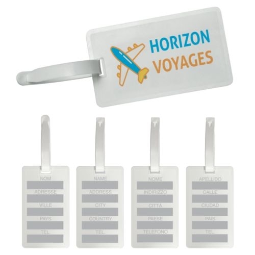 Description Etiquette à bagage avec surface à personnaliser pour permettre d'inscrire des coordonnées.La surface pour écrire (SSE) permet à chaque destinataire d'y inscrire ses noms et adresse pour sécuriser son bagage et compte pour un marquage supplémentaire.L'impression en quadrichromie devient une véritable affiche publicitaire au service des voyagistes, des clubs sportifs, des associations et des hôteliers bien avisés.Les prix comprennent un marquage en 1 couleur à un endroit.Lanières livrées à part non montées |