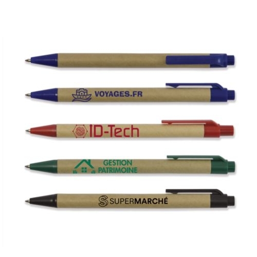 Description Stylo bille écologique, à mécanisme poussoir, composé de carton recyclé.Encre bleue.Encre bleueStylo bille à mécanisme poussoir.Le corps en carton recyclé.Les prix comprennent un marquage en sérigraphie 1 couleur. Diam. 9 |