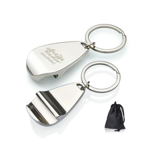 Description Porte-clés en métal chromé, ouvre-bouteille. Présenté dans un pochon individuel.Les prix comprennent un marquage en 1 couleur ou une gravure au laser. |