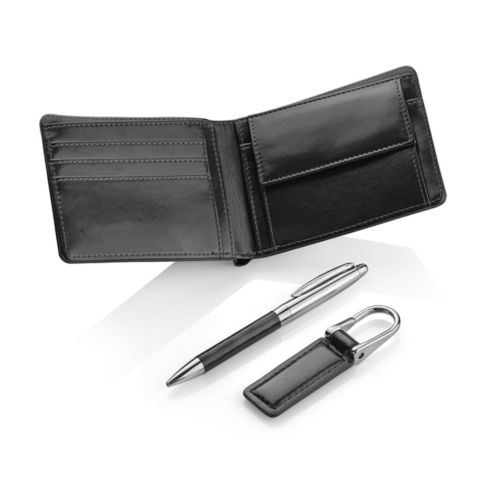 Description L'ensemble-cadeau comporte un portefeuille, un porte-clés et un stylo à bille métallique. Le portefeuille est fabriqué en cuir écologique. Il comporte 2 rangements pour les billets, une poche pour les monnaies et autres poches supplémentaires pour les cartes de crédit ou les réceptions. L'ensemble est emballé dans une boîte noire élégante. Le logo sera gravé aussi sur chaque éléments de set que sur la boîte. Long. 92 Larg. 120 H. 18 |