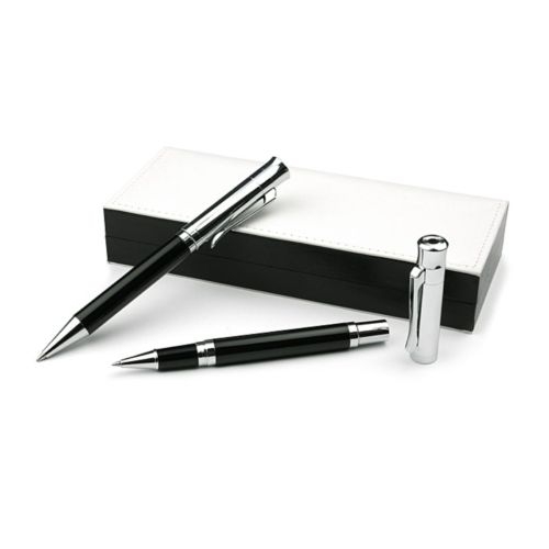 Description Kit d'écriture WASHINGTON D. C. contenant stylo et stylo à bille en métal et étui fabriqué en cuir écologique. Les instruments emballés dans une boîte blanche. |