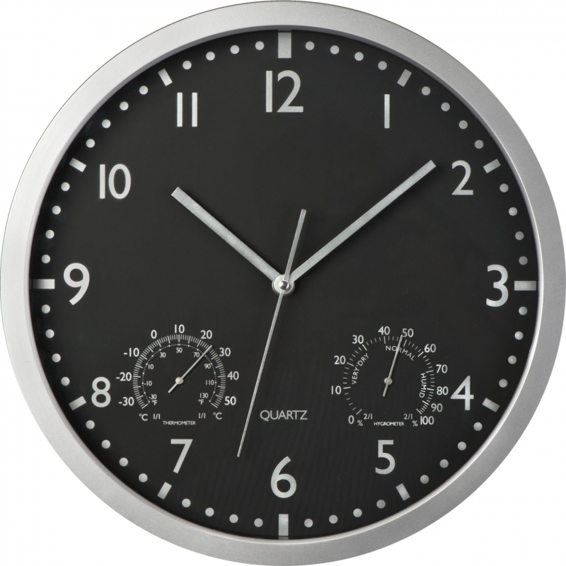 Description Horloge avec hygro- et thermomètre. Le cadran peut ètre enlevécomplètement pour un marquage plus simple sur la surface. Batterie non inclus : 1 x UM3 Diam. 350 |