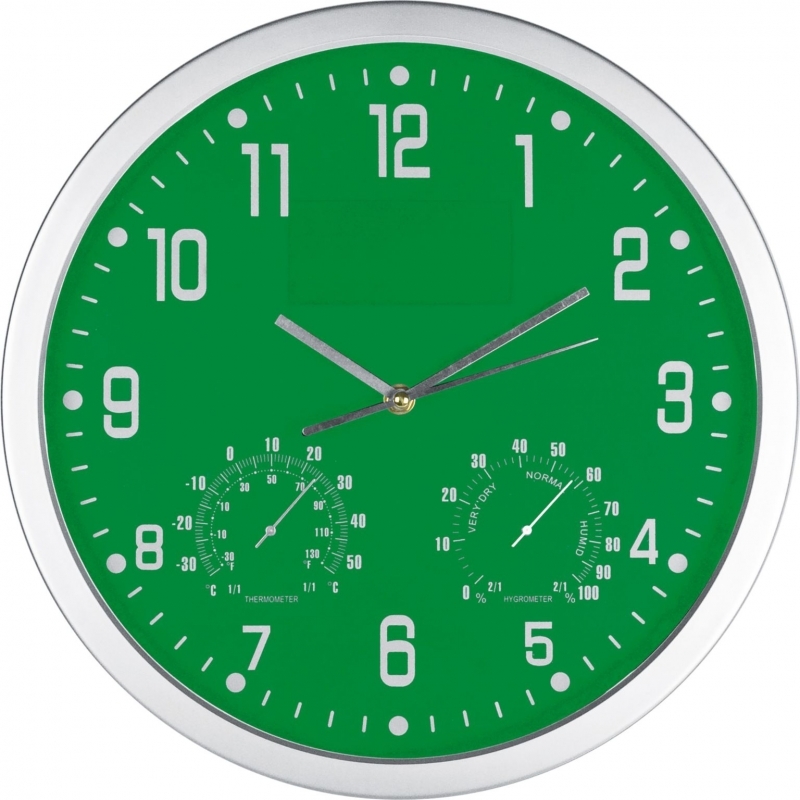 Description Horloge avec thermomètre et hygromètre. Tampographie sur la plaquette amovible. Batterie non inclus : 1 x UM3 Diam. 348 |