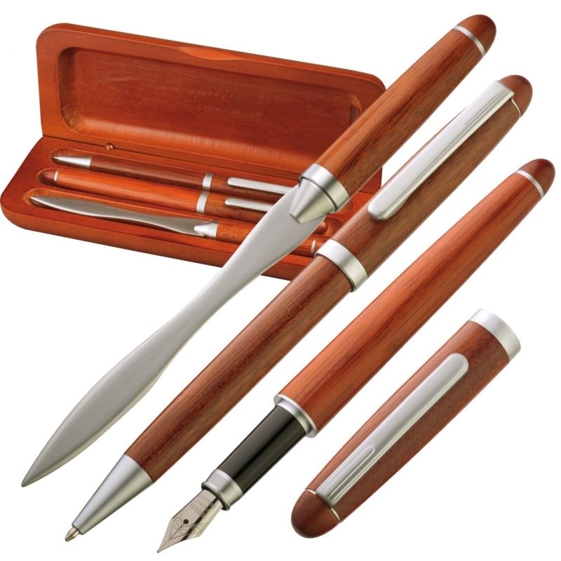 Description Set stylo à bille, stylo à encre et coupe-papier dans une boîte* (bois de rose). Gravure laser sur la boîte. |