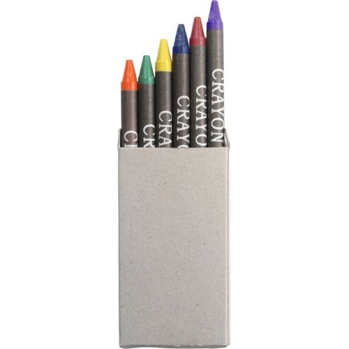 Set de 6 crayons gras.Matières : Papier/Cire/cardboard 350 gsm.Marquages : Tampographie : Face avant ; Tampographie : Au dos ; Sticker digital : Face avant. Larg. 50 H. 9 Long. 90