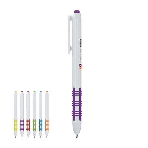Description L'indémodable stylo blanc à grip couleur, toujours efficace pour concilier ergonomie et fantaisie ! Stylo bille, corps et clip plastique avec grip, écriture noire, pointe de 1,0 mm. Marquage sur le corps en 1 couleur.ABS Diam. 10 |