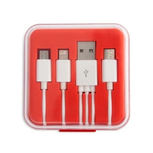 Boîtier avec câble de chargeur 3 en 1. Présenté dans un étui avec support pour smartphone intégré. Connexion micro USB, type C et Lightning.6,7cm/3,3cm/6,8cm