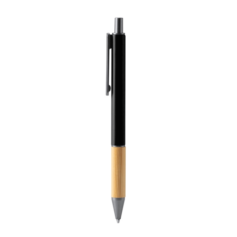 Description Stylo à bille en mat avec prise en bambou et détails de couleur foncée. Encre bleue. |