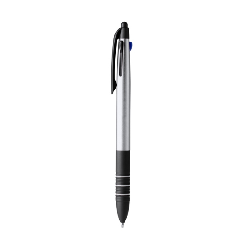 Description Stylo à bille rétractable à 3 encres. Corps en ABS avec détails en noir et poignée douce. Pointeur tactile. Encre bleue, noire et rouge. |