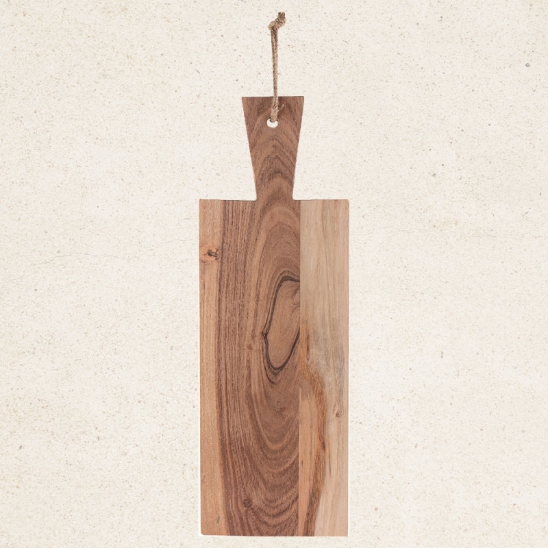 Description Planche à découper rectangulaire en bois d'acacia, avec cordon en jute. Laver à la main et ne pas passer au micro-ondes. Il est recommandé de l'huiler avant de poser de la nourriture. |