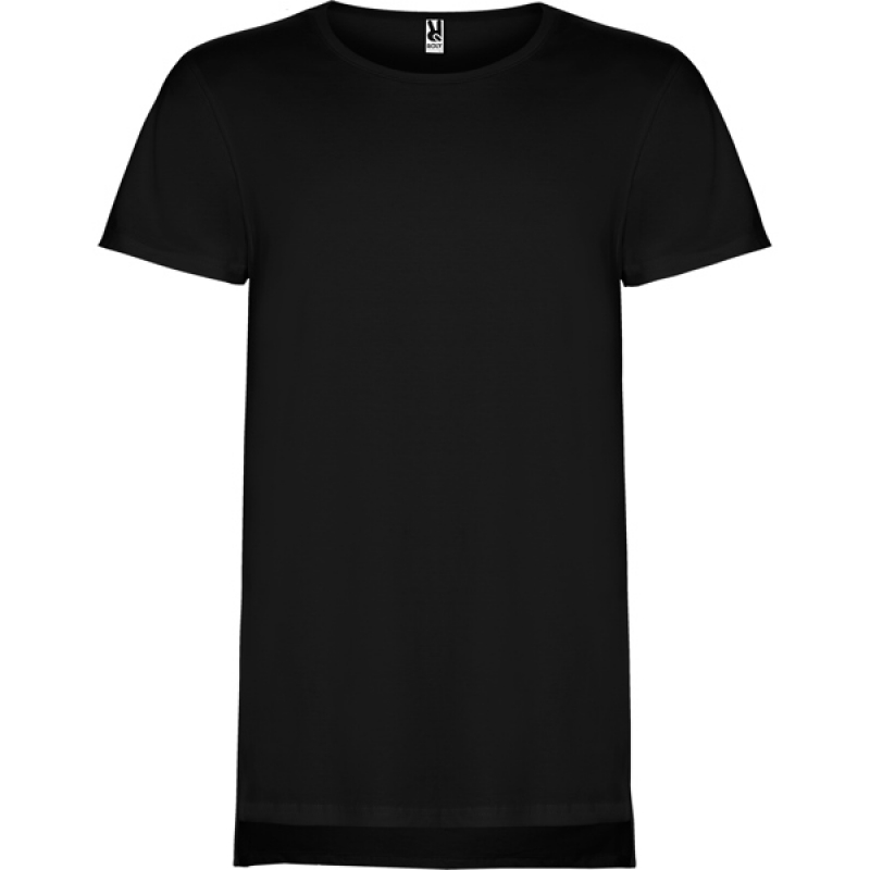 T-shirt manches courtes, bas allongé, encolure ronde deux couches avec élasthanne. Ouvertures sur les bas des côtés. Le dos est légèrement plus long que le devant.