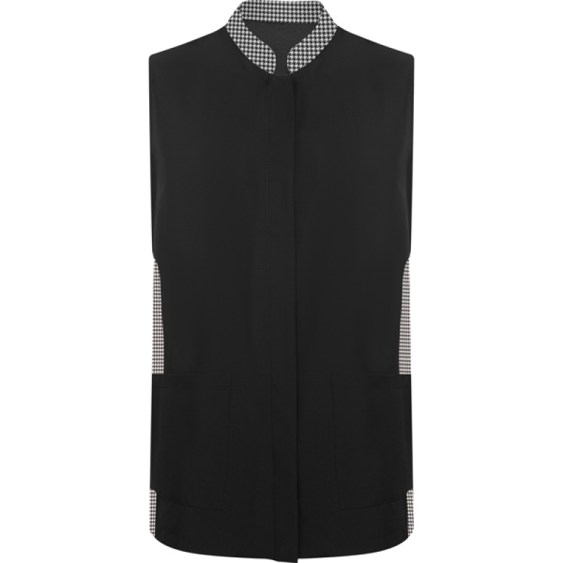 Blouse femme sans manches. · Fermeture centrale avec boutons-pression cachés. · Col mao, coutures latérales et pinces poitrine. · Deux poches plaquées devant.