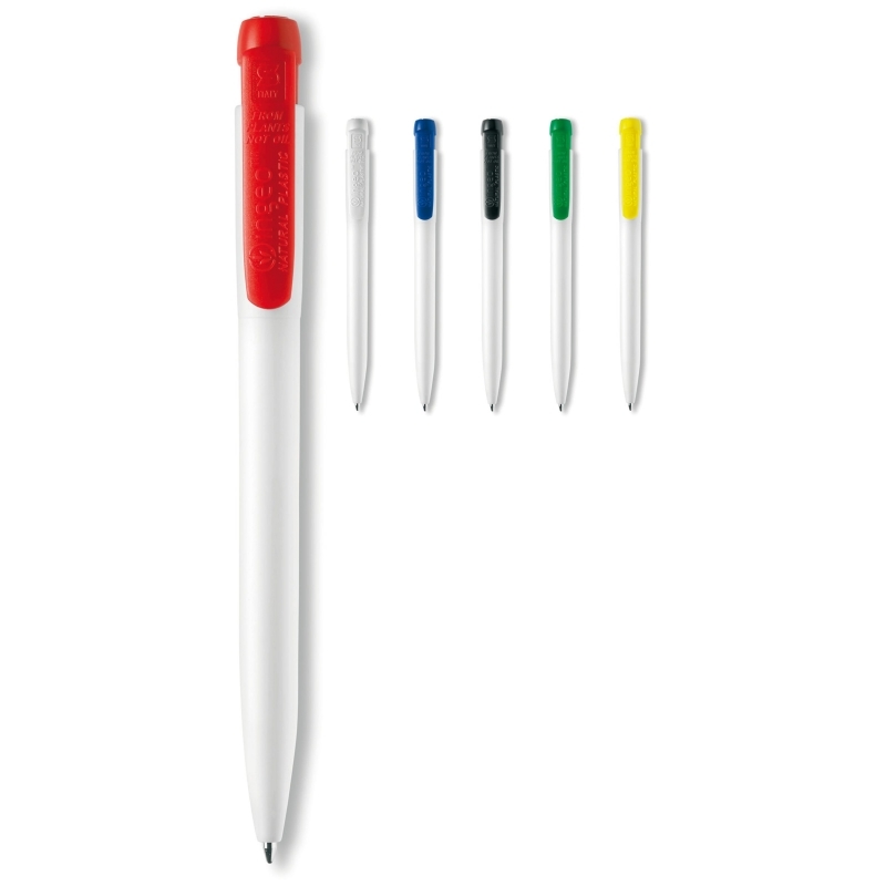 Description Stylo bille Ingeo TM de couleur blanche avec clip coloré. Fabriqué en PLA qui est un matériau biodégradable. Un article promotionnel durable. Sa cartouche X20 écrit jusqu’à 2.5km, écriture par défaut bleue. Le stylo est fabriqué en Europe. À partir de 5.000 pièces, vous pouvez choisir vos propres couleurs. |