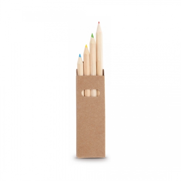 Boîte gamme nature de 4 crayons en bois. Set de 4 crayons avec mine bleu, jaune, vert et rouge avec corps hexagonal. Présenté dans une boîte avec fenêtre en carton kraft recyclé.