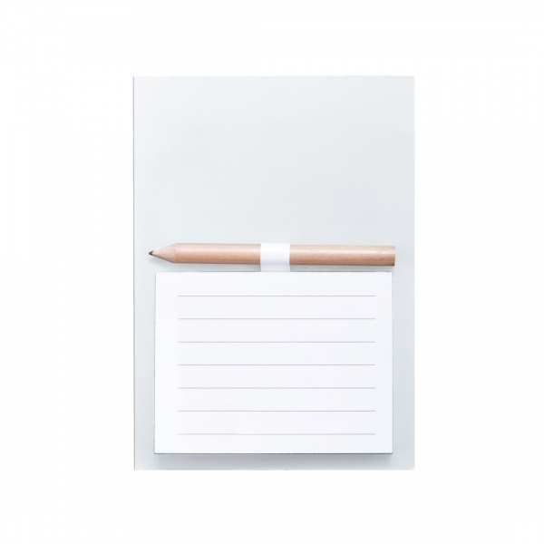 Description Bloc notes magnétique en carton résistant en coloris vifs et variés. Bloc de 40 feuilles lignées avec support pour mini crayon inclus.  |