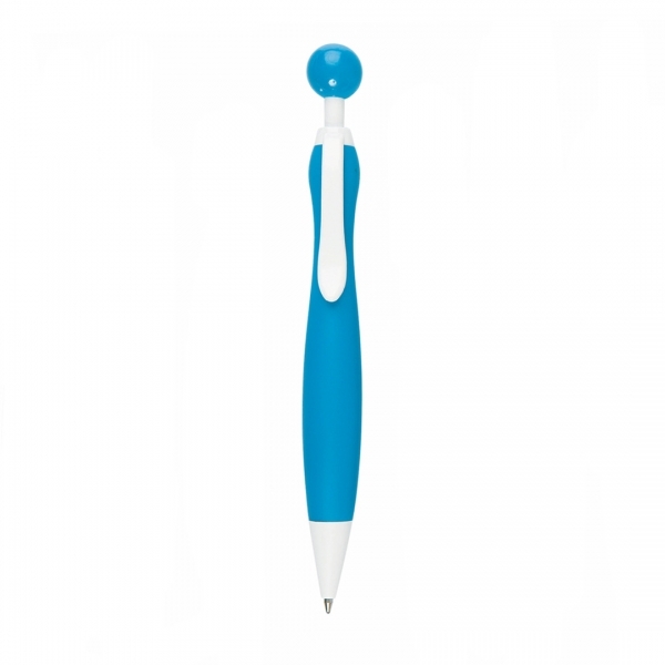 Stylo à bille à bouton poussoir de conception bicolore avec attributs blancs et corps courbe en couleurs unies. Clip poussoir original en forme de boule assortie. Cartouche jumbo. Encre bleue.