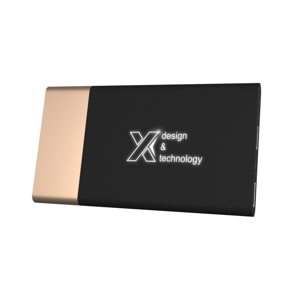 Description Batterie bi-matière rubber et métal de 5000 mAh avec logo lumineux et double sortie USB 5V/2A. Le logo s'illumine dès que l'on touche le powerbank grâce à la fonction shake.  |