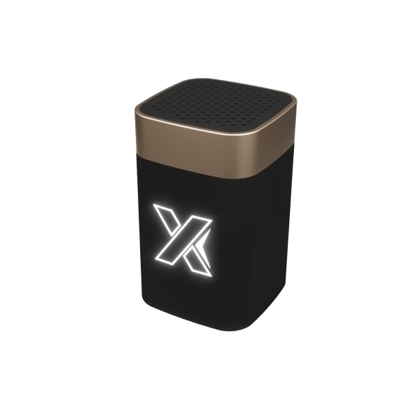 Description Enceinte Bluetooth 5W avec logo lumineux personnalisable, finition métal et rubber. Deux enceintes peuvent être couplées et mises en stéréo. Fonction conférence téléphonique avec micro intégré. 4 finitions de métal possible : argent, or et or rose.  |