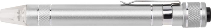 Description Tournevis en métal et aluminium avec 3 embouts plats et 3 embouts cruciformes muni d'une LED. |
